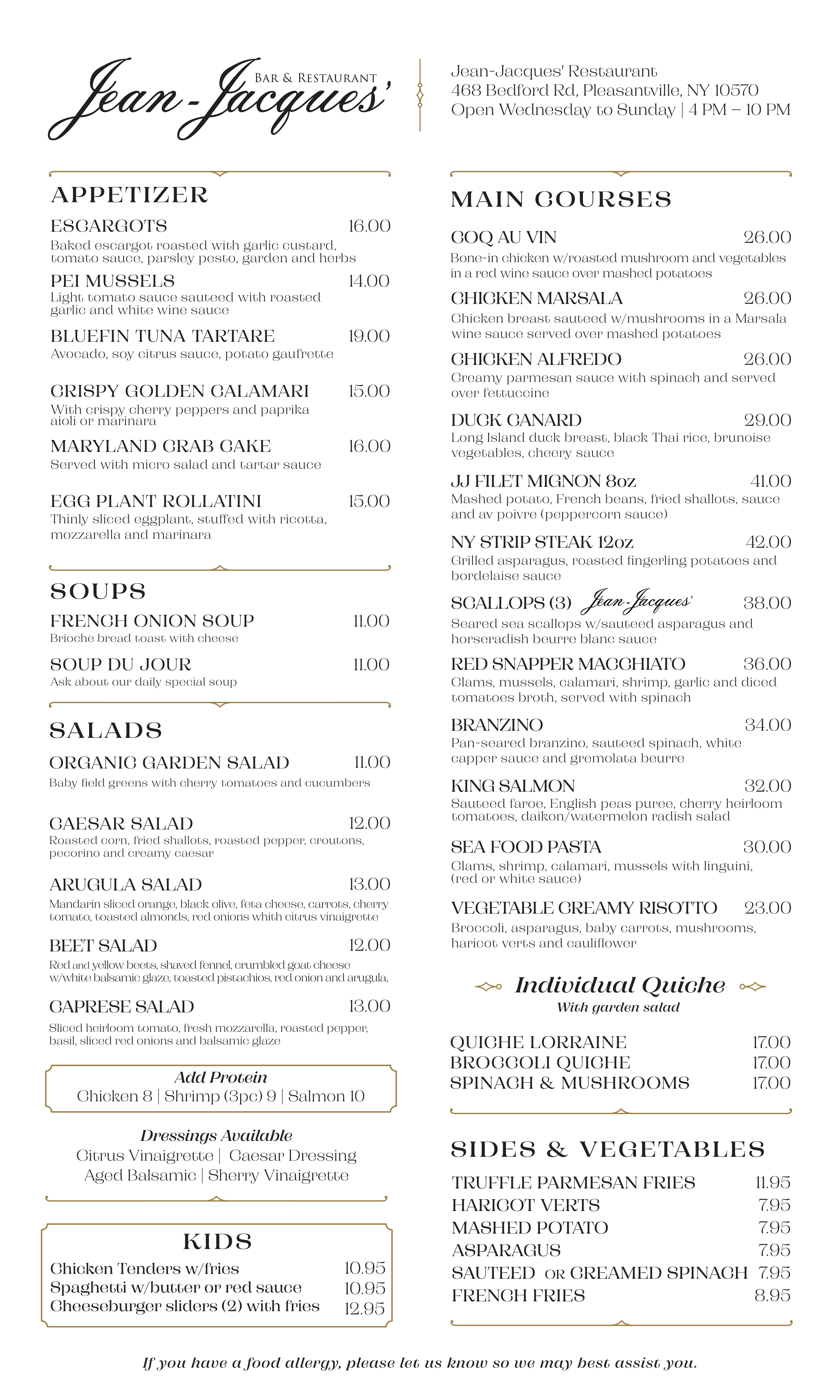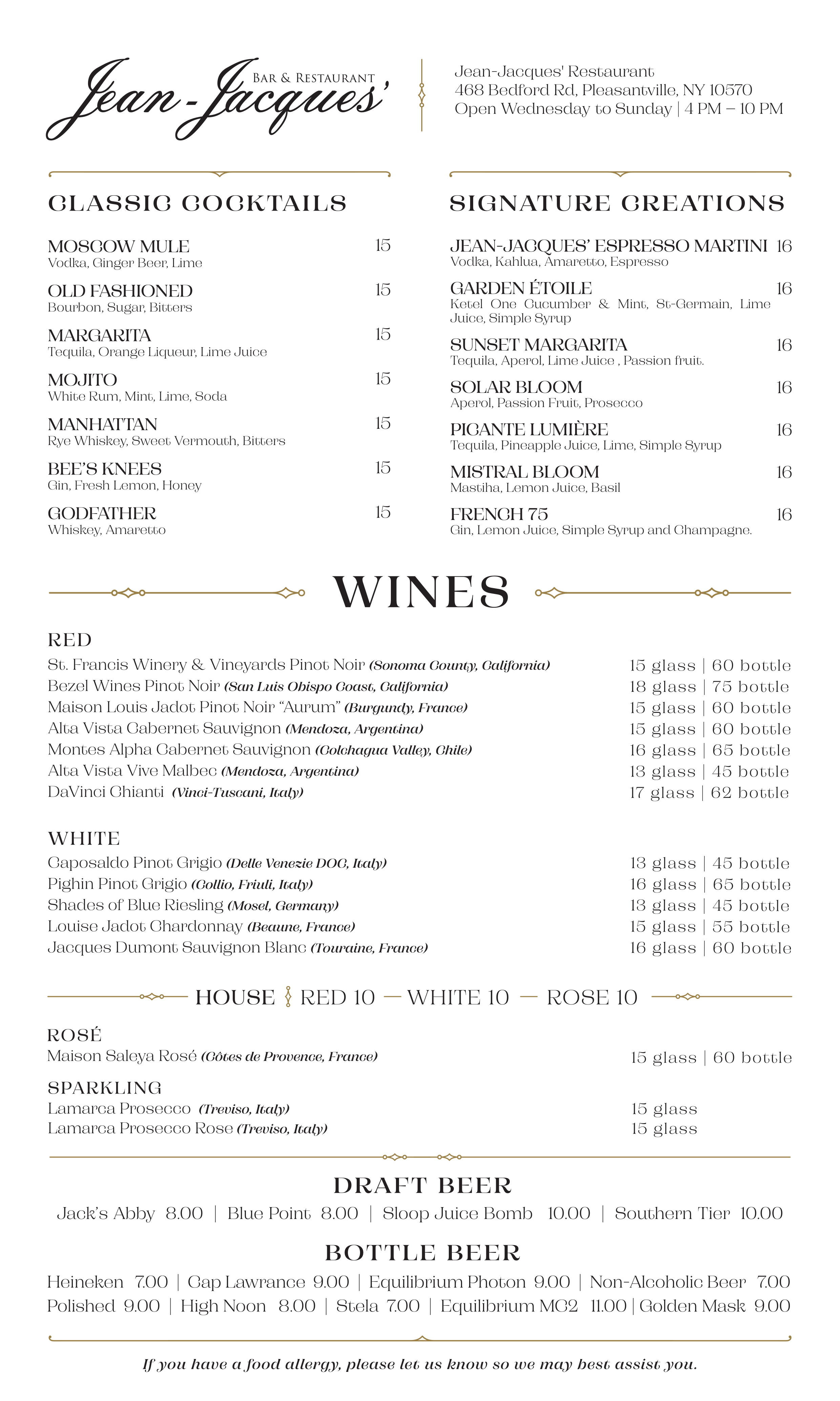 Jean-Jacques Bar & Restaurant Now Serving Dinner Join us for a warm, French-inspired evening, Wednesday to Sunday, 4–10 PM.